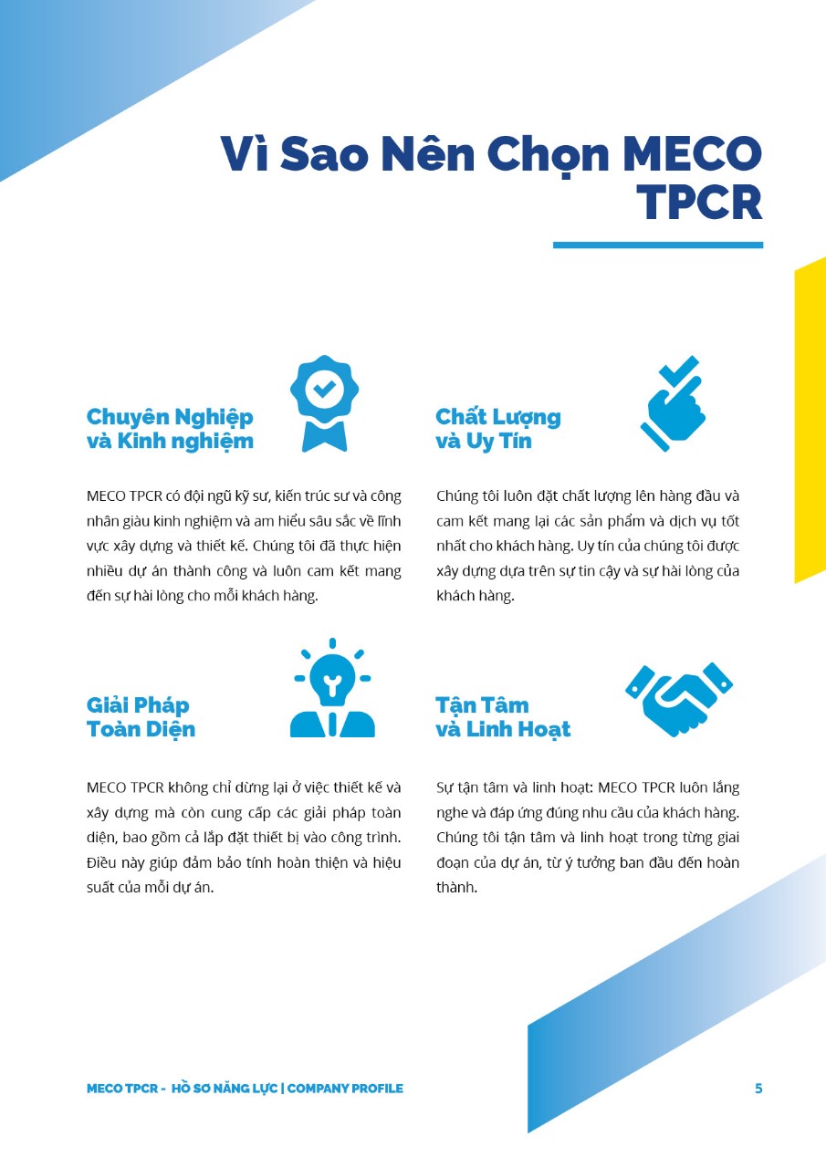 Được thành lập nhiều năm trong ngành với khát vọng đem lại giải pháp toàn diện trong lĩnh vực thiết kế và xây dựng. Chúng tôi là đơn vị chuyên thiết kế và thi công các công trình dân dụng, công nghiệp và phát triển nông thôn, bao gồm các dự án nhà dân, nhà phố, nhà xưởng, cầu đường. Với đội ngũ kỹ sư, kiến trúc sư và công nhân lành nghề, MECO TPCR tự hào có thể mang đến thành công cho tất cả dự án.